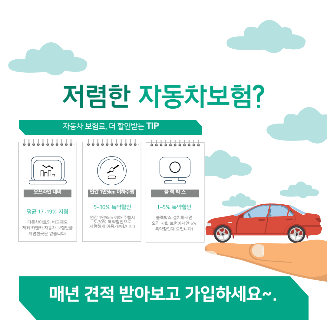 매년 갱신하는 보험의 대표적인 상품은 바로 자동차 보험입니다. 그럼 과연 자동차 보험은 어떻게 가입하는 것이 합리적이고 소중한 내 돈을 아낄 수 있을까요? 오늘은 자동차보험 가입하는 팁을 공유해볼까 합니다.